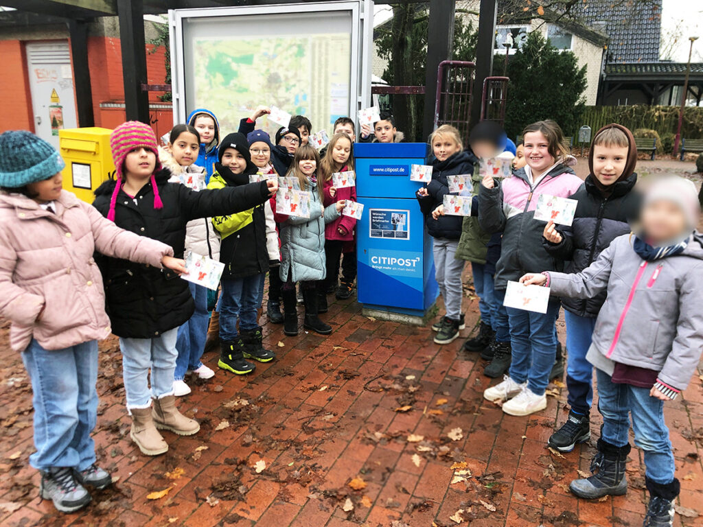 Eine der ersten Schulen, die unserem Aufruf „CITIPOST – Wir machen Schule“ gefolgt ist, ist die Grundschule Godshorn. Den Deutschunterricht der 3. Klasse zum Thema „Briefe schreiben lernen“ unterstützte die CITIPOST mit Postkarten. So lernten die Schüler anhand von Postkarten, wo Textfeld, Adressfeld und auch die Briefmarken ihren Platz finden. Zum Abschluss wurden die Postkarten gemeinsam zum blauen Briefkasten gebracht und eingeworfen.